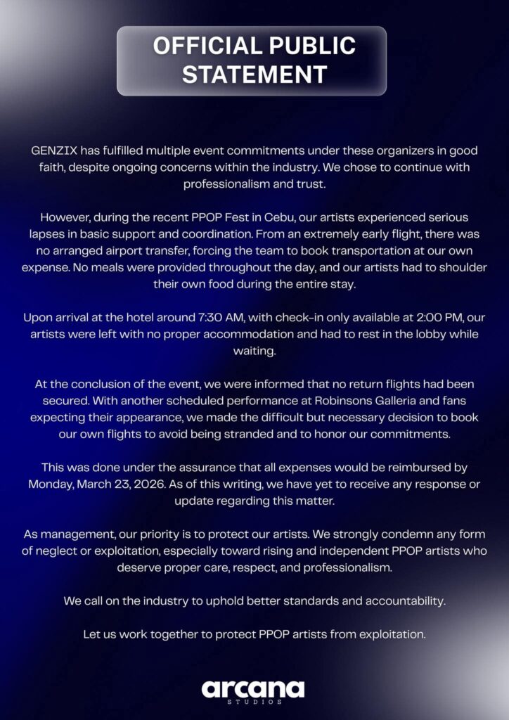 フィリピンの次世代音楽シーンを牽引するP-POPグループGenZixのマネジメントを担う「Arcana Studios」が、2026年3月、セブ島で開催された「PPOP Fest」における運営側の不手際を告発する公式声明を発表した。華やかなステージの裏側で、アーティストたちが直面した過酷な状況とはどのようなものだったのか。
