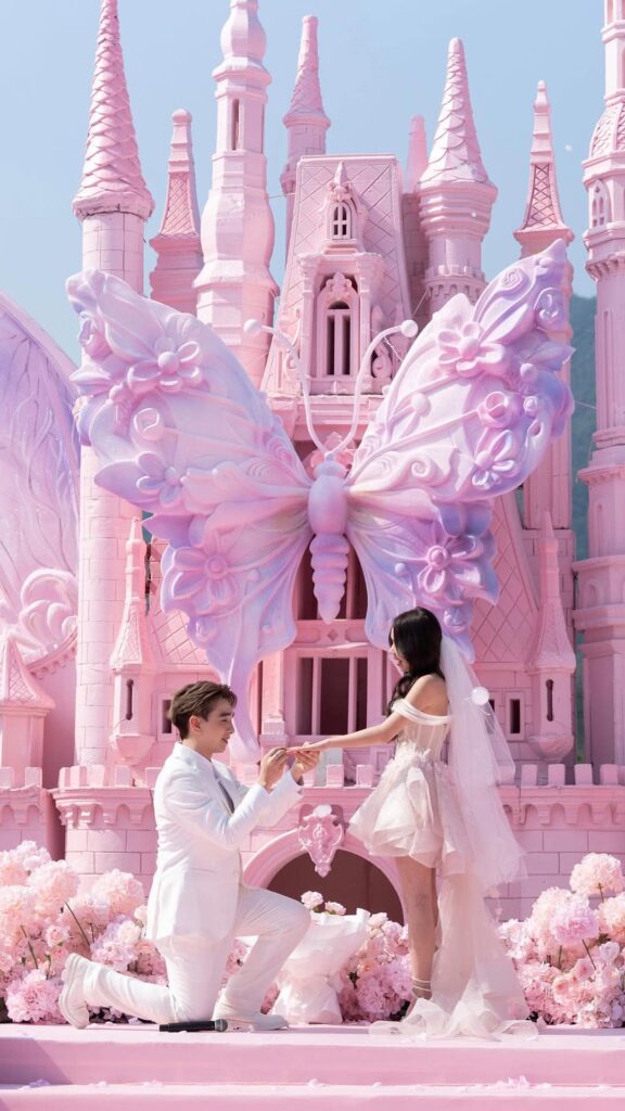 さらに驚くべきは、そのスケールの大きさ。Perryは二人の門出を祝うため、家族や親しい友人ら総勢67名をマレーシアから杭州へと招待。ゲストたちは異なる都市から、この瞬間のためだけに駆けつけた。会場に現れたJia Yiは、親友たちから一輪ずつピンクのバラを受け取り、涙を流しながらPerryの待つ城の前へと歩みを進め、そこで彼がひざまずき指輪を差し出すと、幸せいっぱいに「Yes」と答えた。