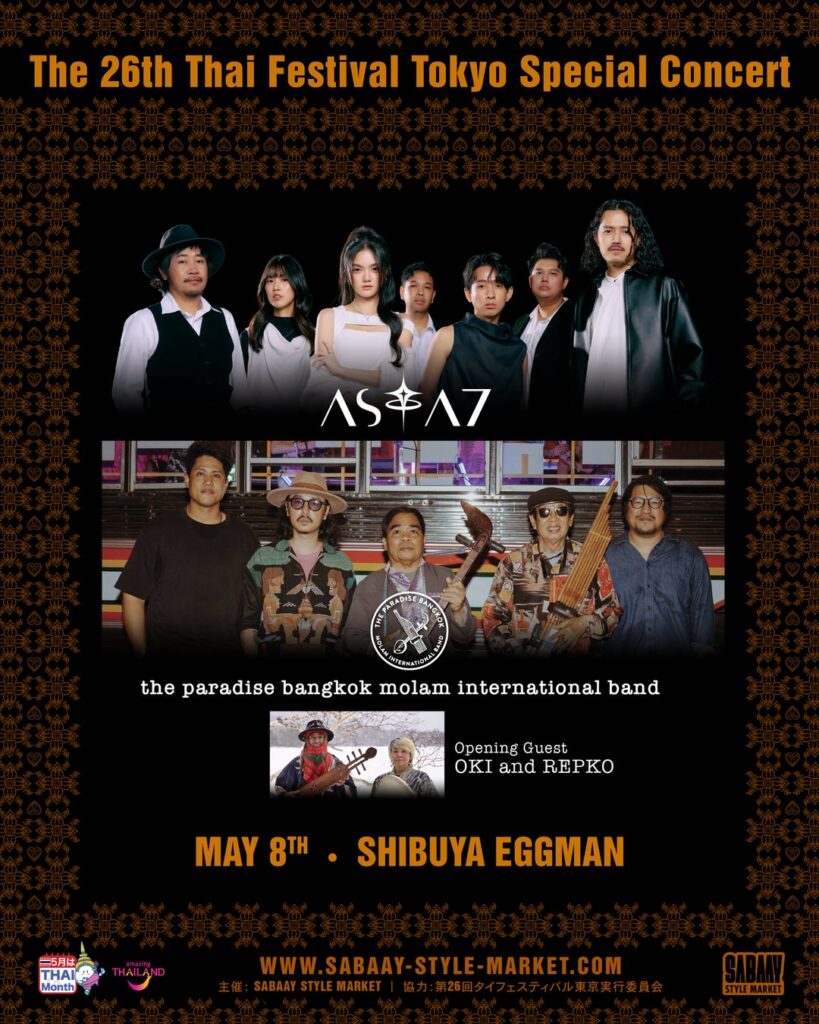 今回のスペシャルコンサートは、5月5日(火・祝)と、5月8日(金)から5月10日(日)までの計4日間にわたって開催される。タイ音楽・カルチャーを多角的に発信する「Sabaay Style Market」がプロデュースを手がけ、日タイの才能あふれる総勢11組が集結。